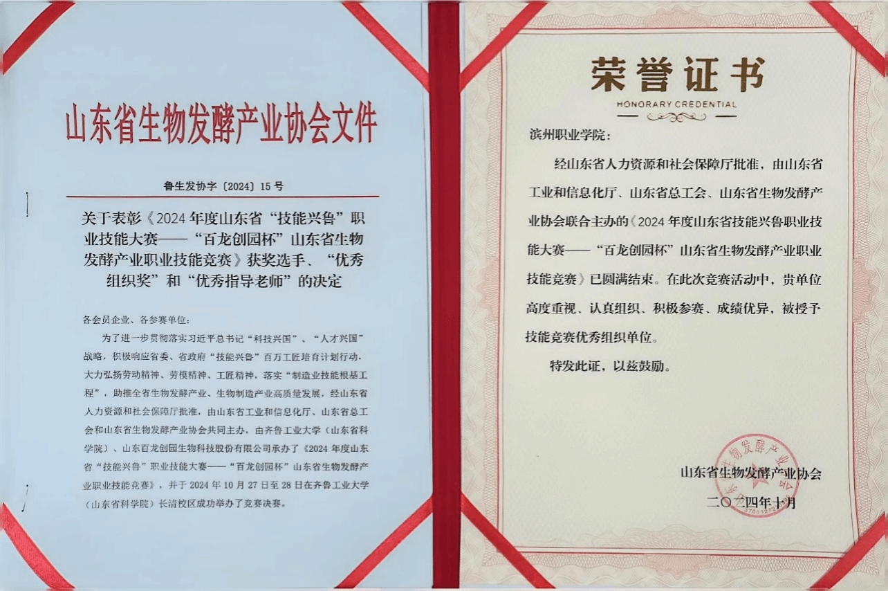 会议表彰了2024年度山东省“技能兴鲁”职业技能大赛——“百龙创园杯”山东省生物发酵产业职业技能竞赛的“优秀组织单位”、“优秀指导教师”及获奖选手。我校荣获“优秀组织单位”称号,1946伟德国际源自英国3名教师获“优秀指导教师”称号,学生在竞赛中获一等奖1项、二等奖1项和三等奖2项。
